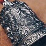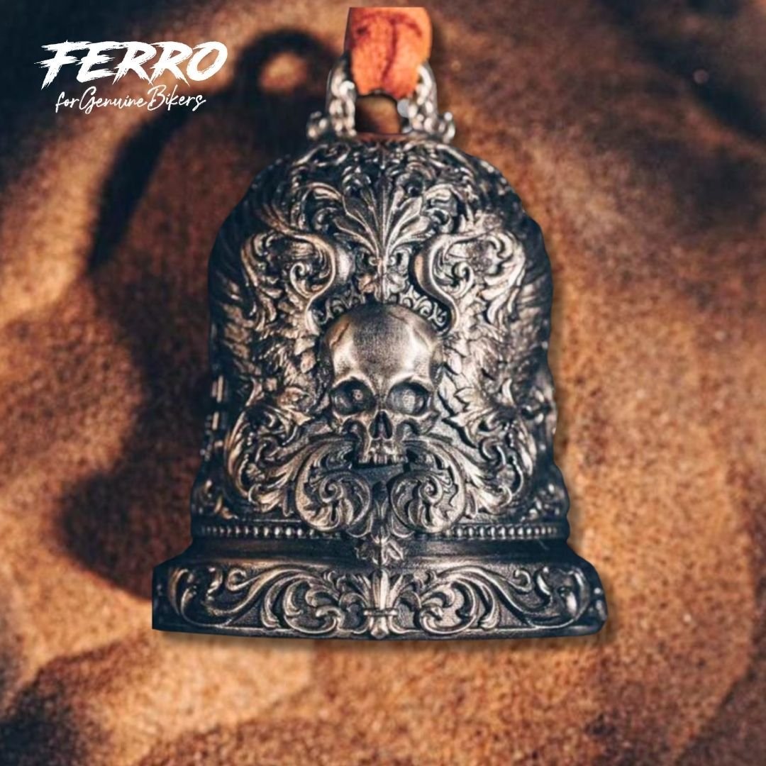 O sino guardião com grandes e detalhados pormenores de gravação com caveira é um amuleto poderoso para quem vive a estrada sem medo.